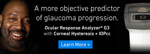 Nur der Ocular Response Analyzer® G3 kann die korneale Hysterese und den korneal korrigierten IOD (IOPcc) mittels patentierter Technologie zur Bestimmung der individuellen biomechanischen Eigenschaften der Hornhaut Ihres Patienten messen. Die korneale Hysterese hat sich als unabhängiger Risikofaktor und als aussagekräftiger für die Entwicklung sowie das Fortschreiten von Glaukomen erwiesen als CCT oder IOP1-3. Dank des Einsatzes von Biomechanik wird der IOPcc weniger durch Eigenschaften der Kornea beeinflusst als die Goldmann-Applanationstonometrie4.