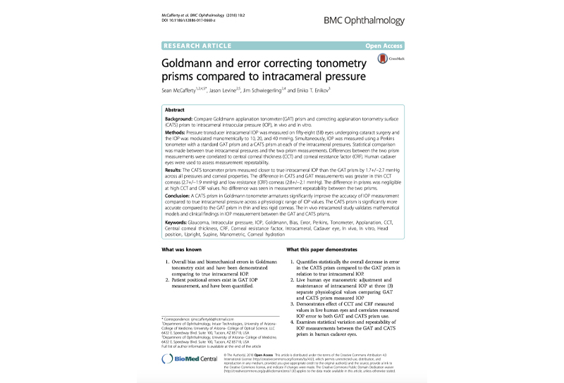 2 - McCafferty S, Tetrault K, McColgin A, Chue W, Levine J, Muller M. Modified Goldmann prism intraocular pressure measurement accuracy and correlation to corneal biomechanical metrics: multicentre randomised clinical trial. Br J Ophthalmol. 2019 Dec;103(12):1840-1844. doi: 10.1136/bjophthalmol-2018-313470.