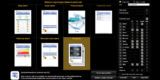 Multiple dry eye reports available to view, print, share with patients, and send to EMR as PDF.