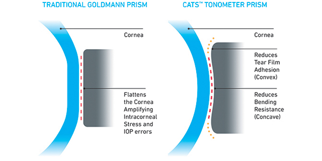 En pacientes con córneas promedio, el prisma de tonómetro CATS coincidirá estrechamente con los resultados de la IOP del prisma Goldmann tradicional, porque el prisma de tonómetro CATS fue diseñado intencionalmente para medir lo mismo que el GAT en pacientes con biomecánica y grosor corneal central promedios. Como las propiedades de la córnea de los pacientes varían del promedio, la diferencia entre los resultados de CATS y los tradicionales de Goldmann aumentará debido a la capacidad del Prisma de tonómetro CATS para "ignorar" factores corneales que producen errores de IOP con el prisma de Goldmann tradicional. El prisma de tonómetro CATS y el prisma tradicional de Goldmann producen medidas similares para córneas normales, lo que garantiza valores de referencia de IOP normal de larga duración y se mantienen las presiones altas, lo que permite a los médicos integrar sin problemas las lecturas de la IOP de CATS en comparación con sus lecturas históricas de IOP de GAT. 2-4,7,8
