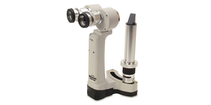 La lámpara de hendidura portátil PSL de Reichert utiliza una fuente de luz LED blanca de alta luminancia, junto con un diseño liviano y compacto, para darle la libertad de usar una lámpara de hendidura en la palma de su mano.